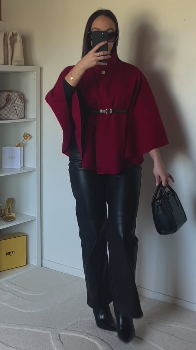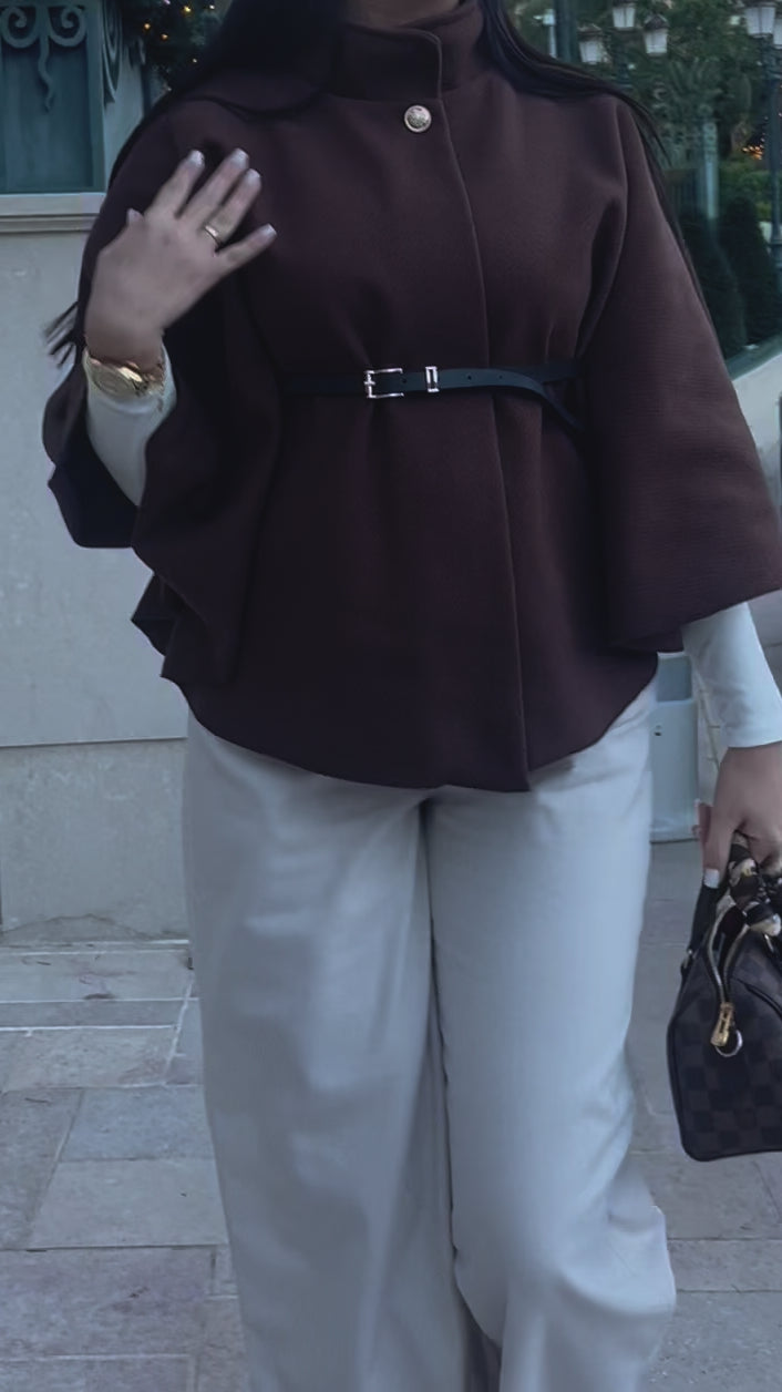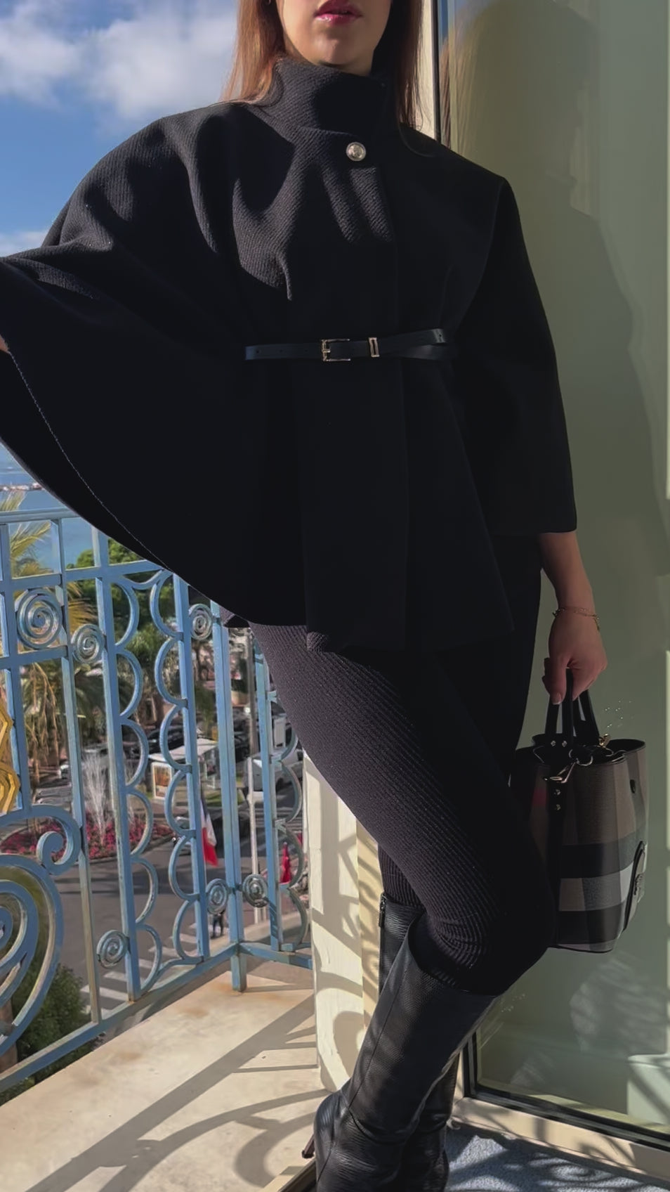 Cape élégante à col montant boutonné et ceinture intégrée à la taille.